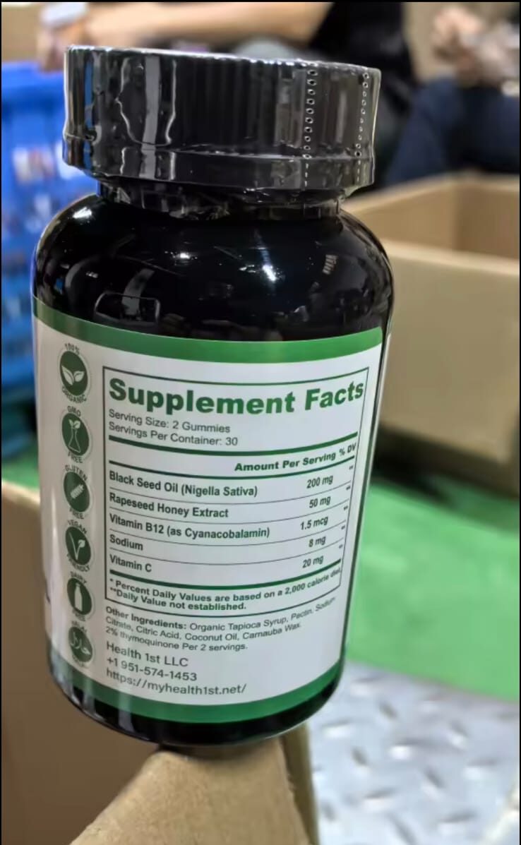 Health 1st Black Seed Gummies are a convenient and tasty way to support your immune system, energy levels, and overall health. Made with cold-pressed Black Seed Oil (Nigella Sativa), these gummies deliver natural antioxidant and anti-inflammatory benefits. Each serving is enriched with Vitamin C to help protect your cells and Vitamin B12 to support energy and brain function.